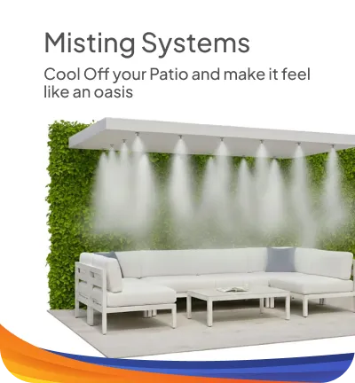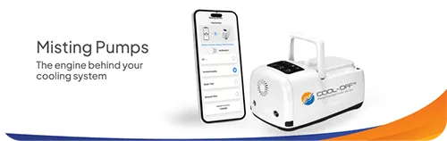 Our lineup includes High-Pressure Misting Fans, Mid-Pressure Misting Fans, Low-Pressure Misting Fans, Portable Misting Fans, complete misting systems, shade sails, and premium patio umbrellas—plus the fittings, filters, and hardware found in Misting Accessories.